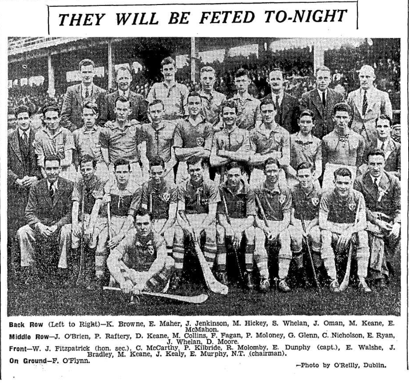 Kevin’s progressed through the Junior championship and in August of 1939, Kevin’s met Commercials in the final in Parnell Park. Commercials started at a hurricane pace scoring two goals in the first ten minutes. Kevin’s soon equalized through Ned Murphy and Gaffney and added another goal from Bradley and two points from Gaffney and Hickey. A double sending off before the half time interval saw a Commericals man and Joe Hickey from Kevin’s sent to the line, with Kevin’s leading 3-2 to 2-2 at the interval. Kevin’s showed up the better team in the second half. With 1-1 from Gaffney, a goal from Byrne and two points from Carton, Kevin’s ran out 5-5 to 3-3 winners. As there was no Intermediate Championship that year the win had sent the club straight up to senior hurling ranks.