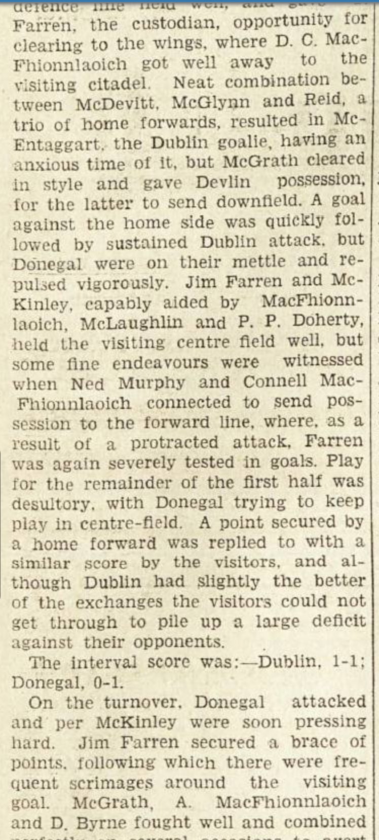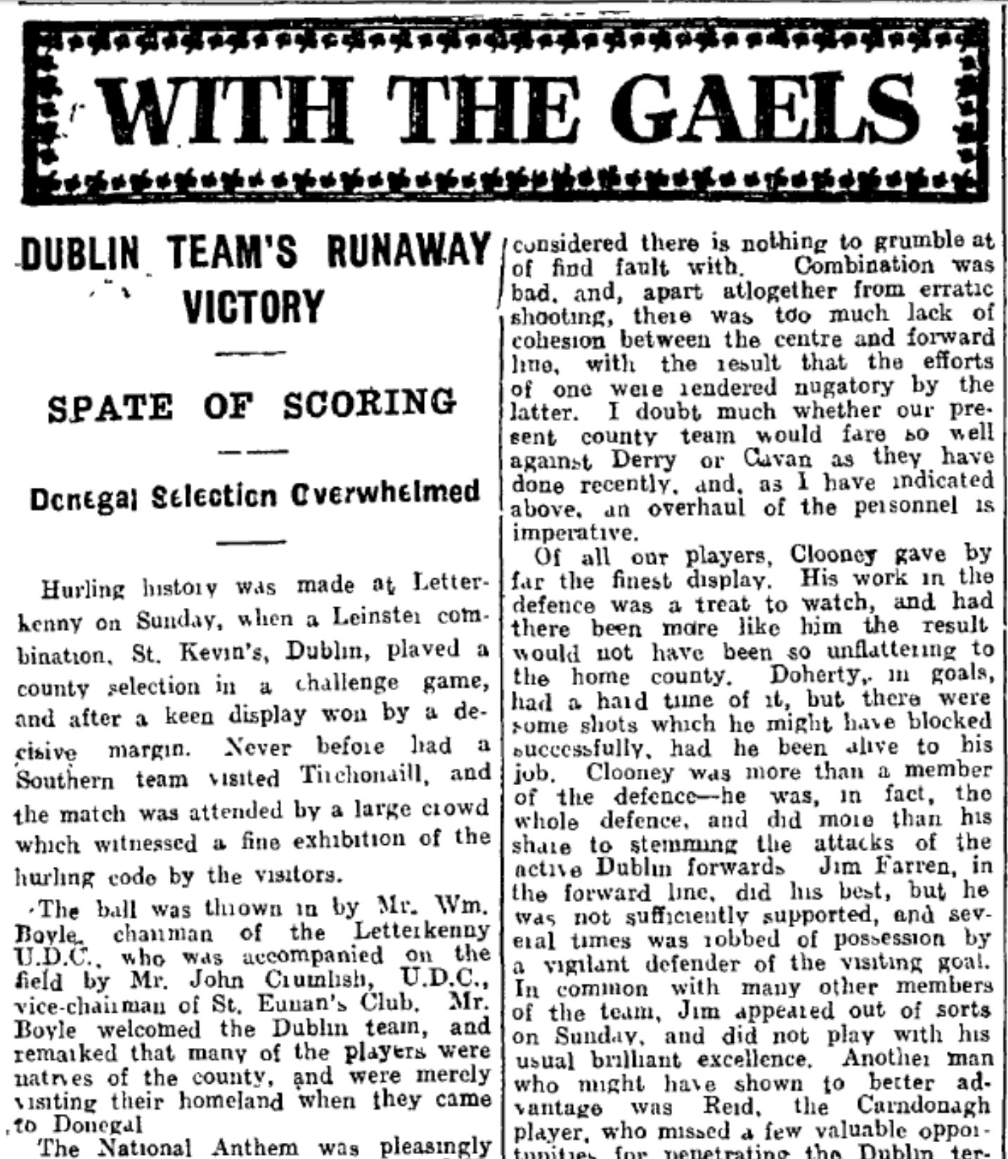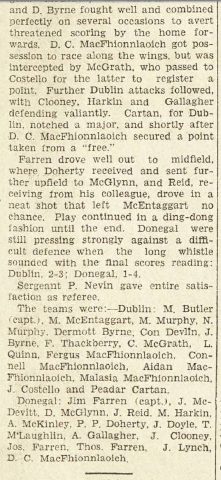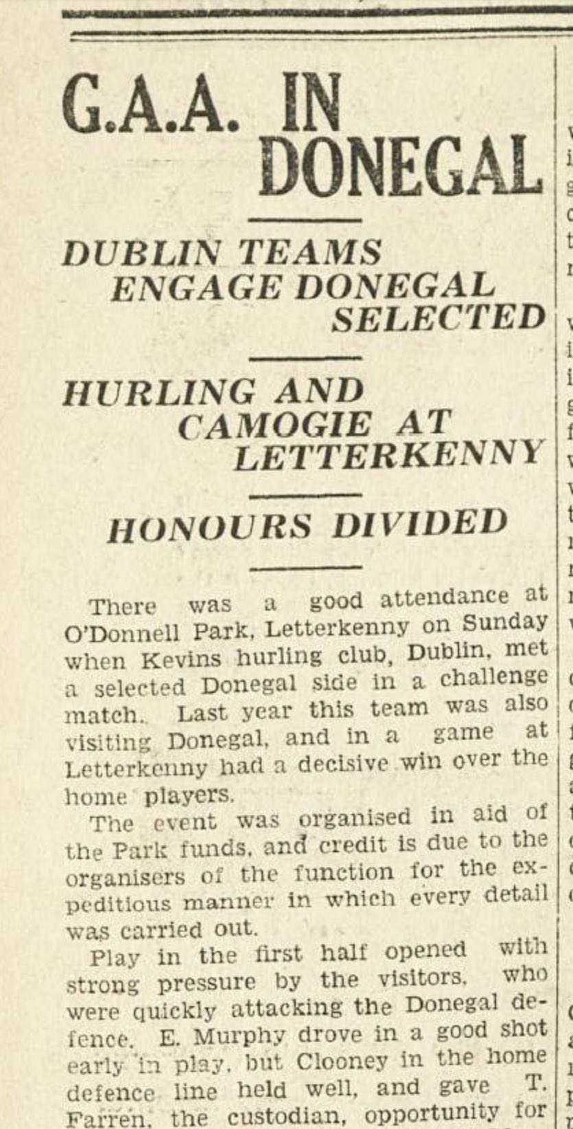 Earlier that decade the club had been dealt a devastating blow when a number of prominent players transferred to Young Irelands sending Kevin’s back down the ranks. However, the club regrouped throughout the 30s and produced some talented underage players. The club also continued with their field trips to Letterkenny in Donegal where they played a Donegal selection and the local club. Dermot Byrne from Hamilton St was a prominent player during this period and some of the younger players who came through included the McGinleys, Somers and Brugha who played with the Dublin minors thoughout the early to mid 1930s. Finbarr Fagan and Jimmy Bradley and Maloney arrived later in the 1930s and the Dublin minors in 1938 who beatKilkenny and Laois to win the Leinster title. They also beat Antrim in the All-Ireland Semi-Final to earn a showdown with Cork who featured Christy Ring in their ranks. While they were eventually beaten by Cork 7-2 to 5-4, the experience was no doubt a positive one in terms of their hurling development. The team was also bolstered by some experienced players including Peader Carton (whose sons and grandsons represented the county in later years) and Sylvester “Vesty” Muldowney who returned to the club after his sabbatical with Young Irelands, which also included playing in a National League and Senior All-Ireland Final.